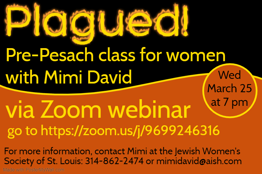 ![]() Join me for this enlightening and informative Pre-Pesach class entitled, Plagued. I look forward to seeing you online! Mimi |